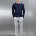 Coupe slim knitted polo with pointed collar. Made from an ultra-soft yarn, knitted into a mid weight fabrication. High shine silver arne branded zippé fastening, concealed with knitted trim. Couleur contrastée tipping to collar, sleeves and hem. Manches longuess with finition côtelée. Finition côtelée to body.