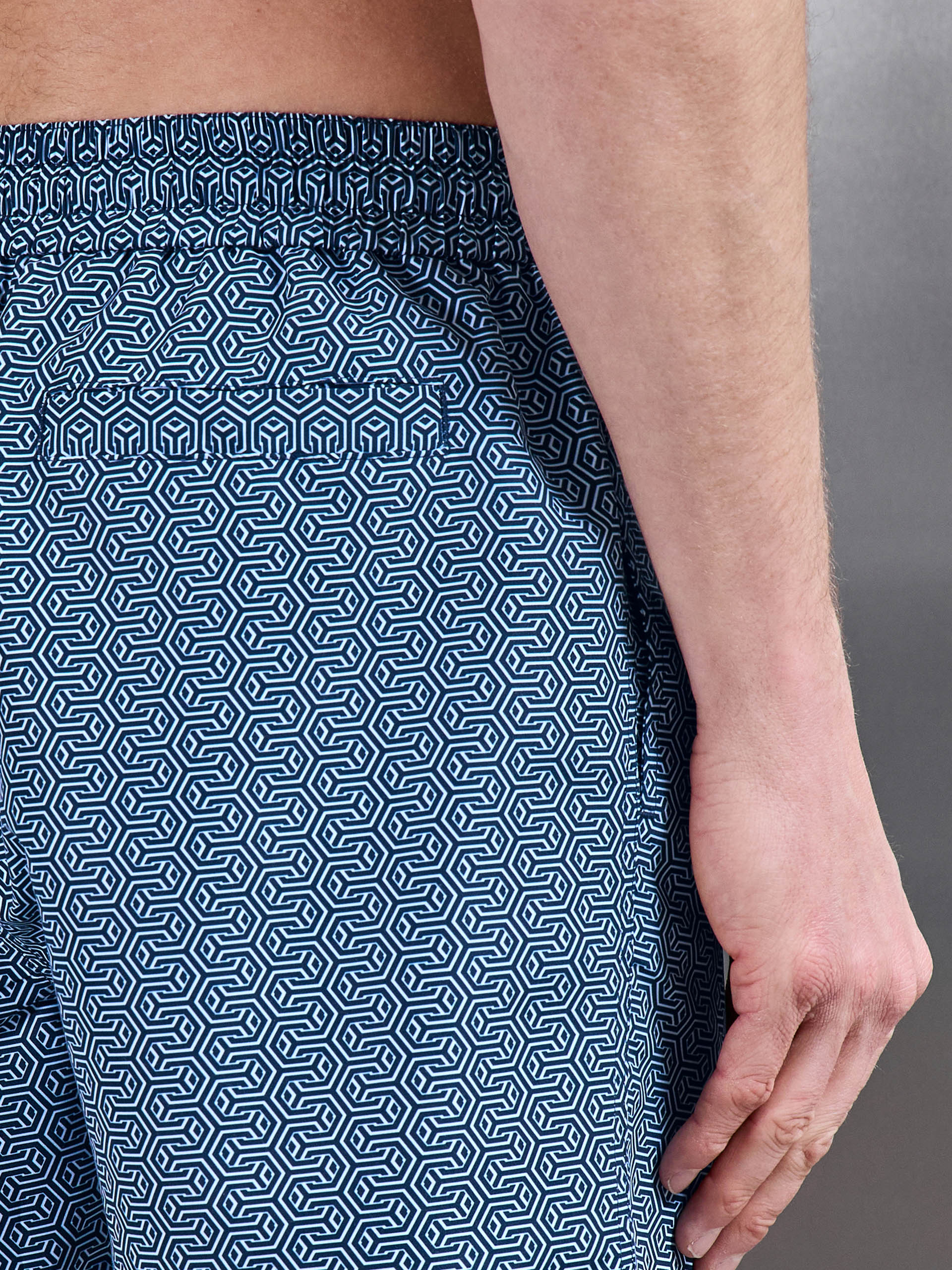 Coupe slim avec ceinture élastiquée. Tissu mat. Imprimé géométrique all-over exclusif. Cordons blancs contrastants avec embouts argentés brillants. Poches latérales à la ceinture et poche dos avec bouton-pression. Doublure filet intérieure. Ourlet cousu.