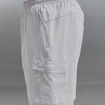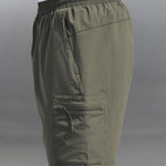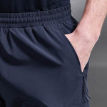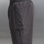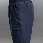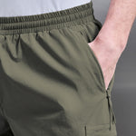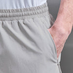 Coupe slim avec ceinture élastiquée. Nylon léger 4 directions. Poches zippées latérales avec cordon. Poches cargo à chaque cuisse avec zip et cordon ton sur ton. Ourlet cousu.