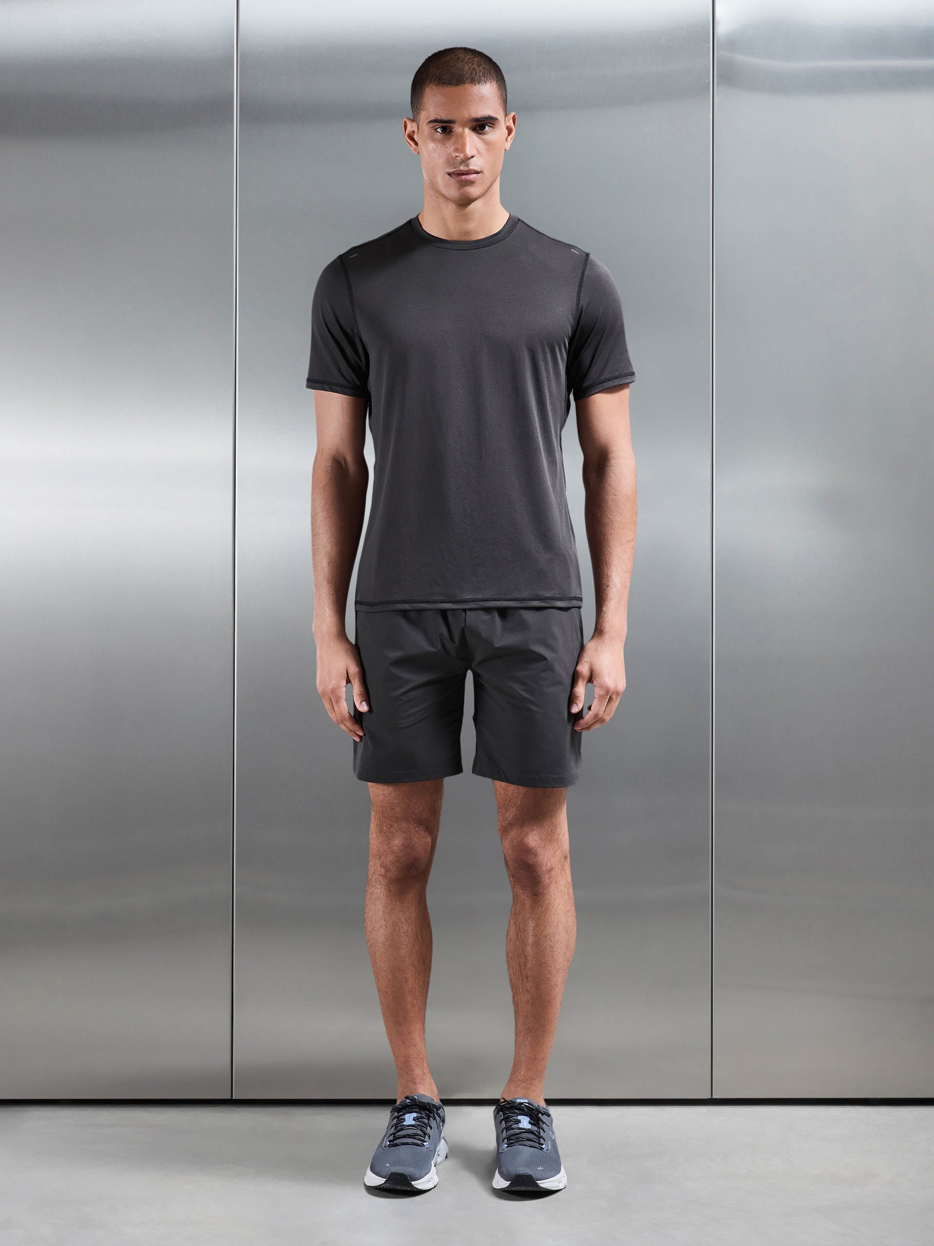 Coupe slim avec ceinture élastiquée. Lightweight nylon fabrication with cut and sew detail to back leg. Cordons de serrage internes. Poches zippées latérales dissimulées. Logo caoutchouc ton sur ton au dos. Détails réfléchissants gris foncé. Ourlet point couvrant ton sur ton.