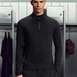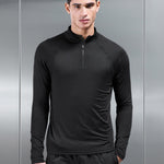 Demi-zip coupe slim avec col cheminée. Jersey léger à texture subtile 4 directions. Fermeture zip ton sur ton avec imprimé réfléchissant gris foncé. Manche raglan longue avec couture plate à l'emmanchure. Logo caoutchouc ton sur ton au col dos. Ourlet cousu sur le corps et les manches.
