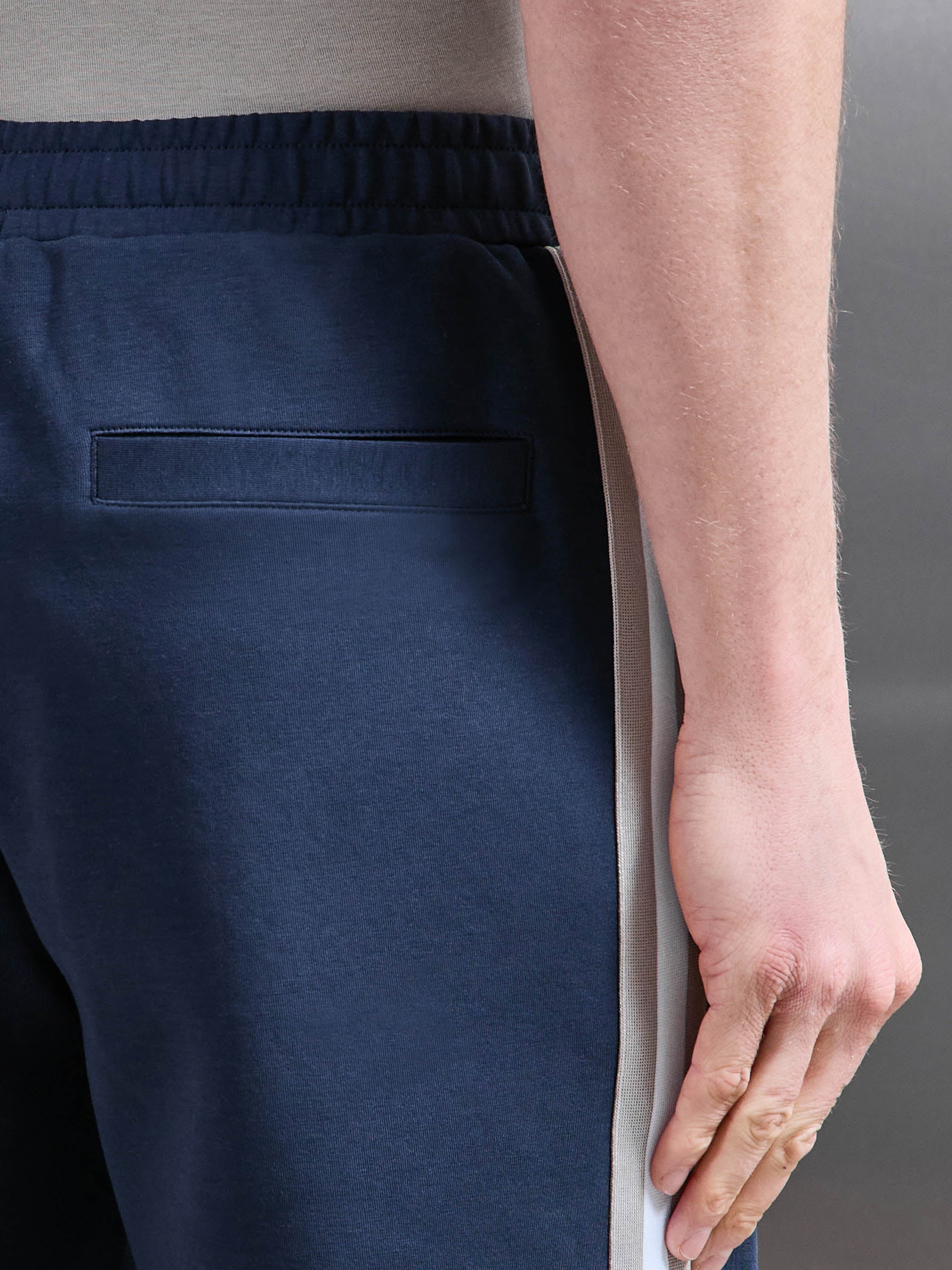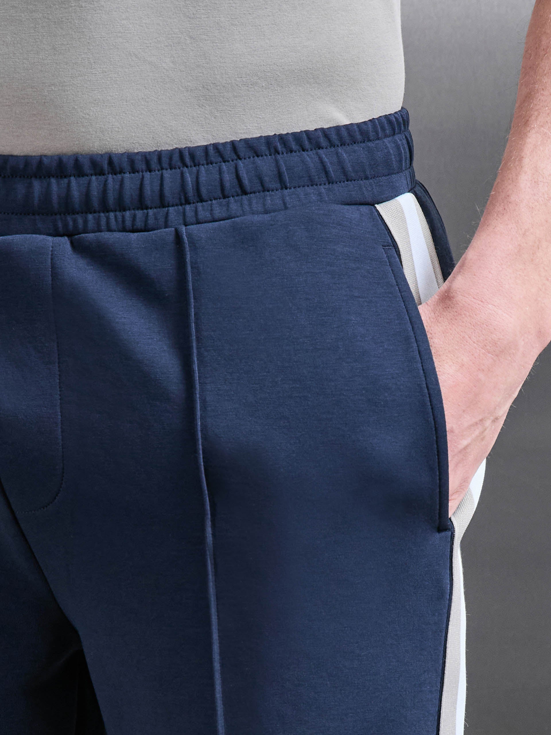Coupe slim avec ceinture élastiquée. Tissu mi-lourd ultra doux. Cordons de serrage internes. Poches latérales à la ceinture et poche passepoilée dos. Bande tricot contrastante sur les coutures latérales. Pince sur chaque jambe. Ourlet cousu.