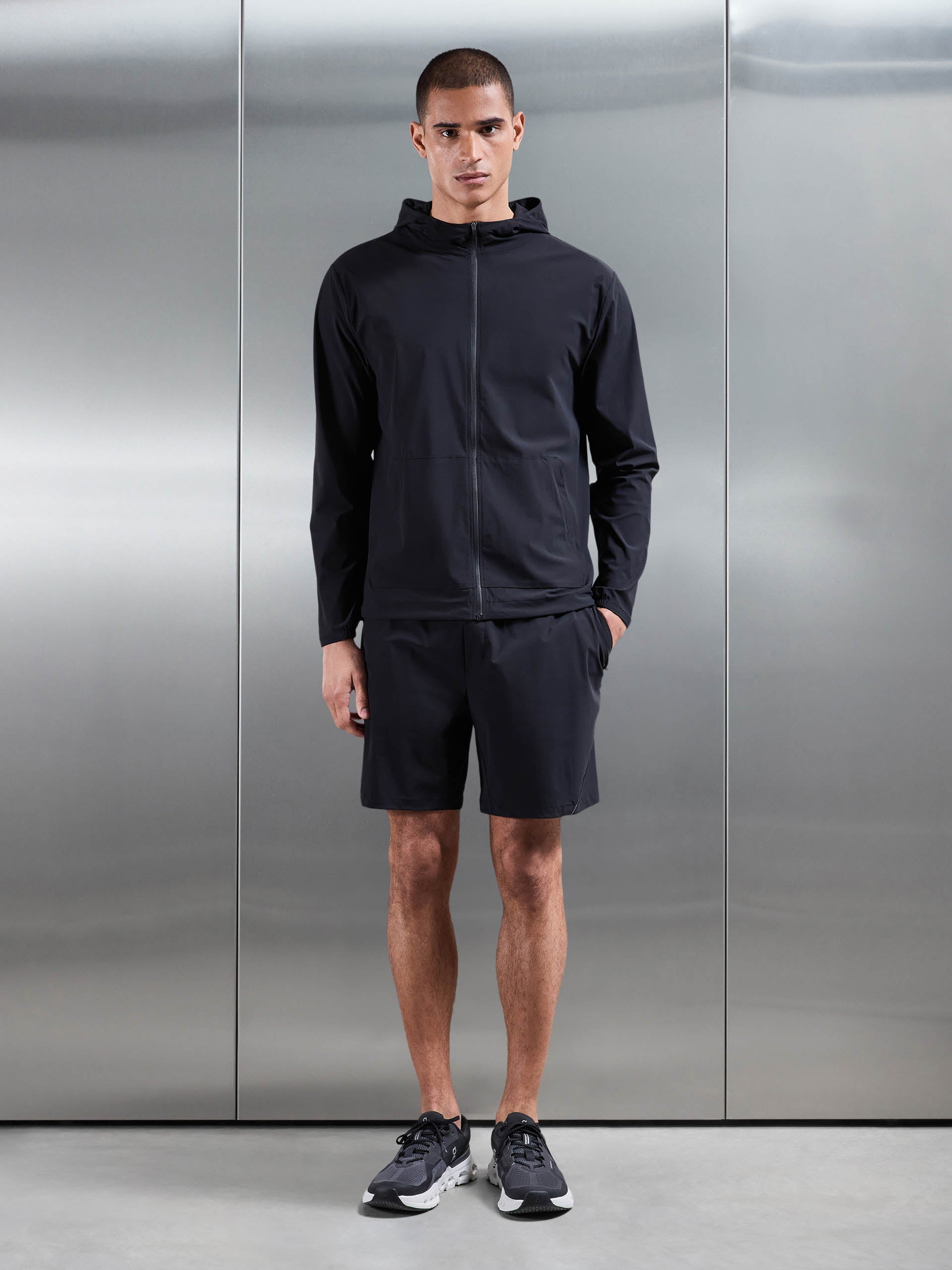 Coupe slim avec ceinture élastiquée. Tissu nylon léger avec stretch. Cordons internes ton sur ton. Poches zippées latérales dissimulées. Logo caoutchouc ton sur ton au dos. Détails imprimés réfléchissants gris. Ourlet cousu.