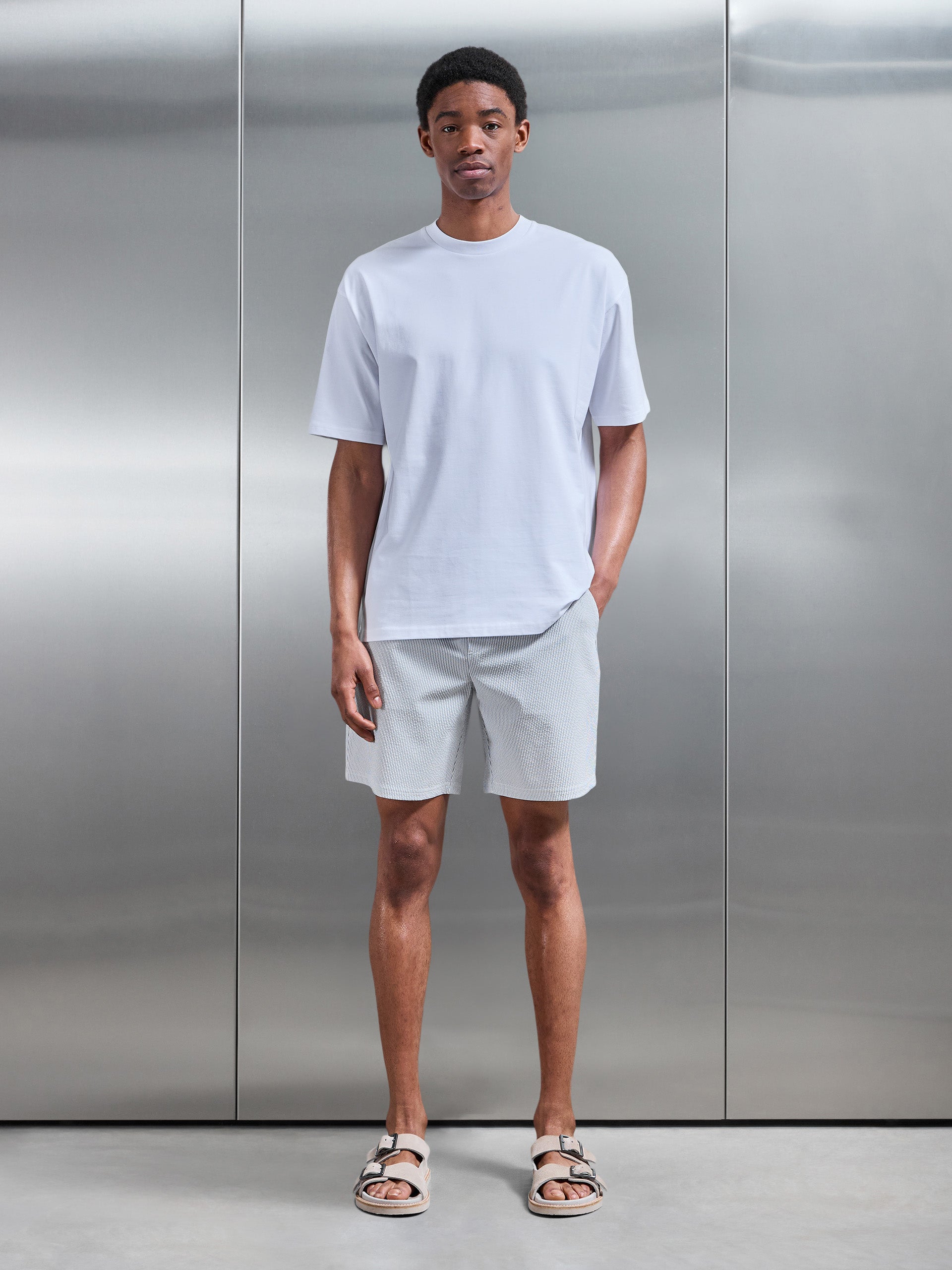 Coupe slim avec ceinture élastiquée. Seersucker léger avec rayure contrastante. Internal white drawcords with high shine silver cord tips for adjustable fit. Poches glissières with Poche dos supplémentaire. Ourlet cousu ton sur ton.