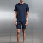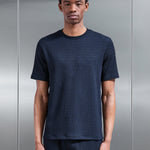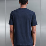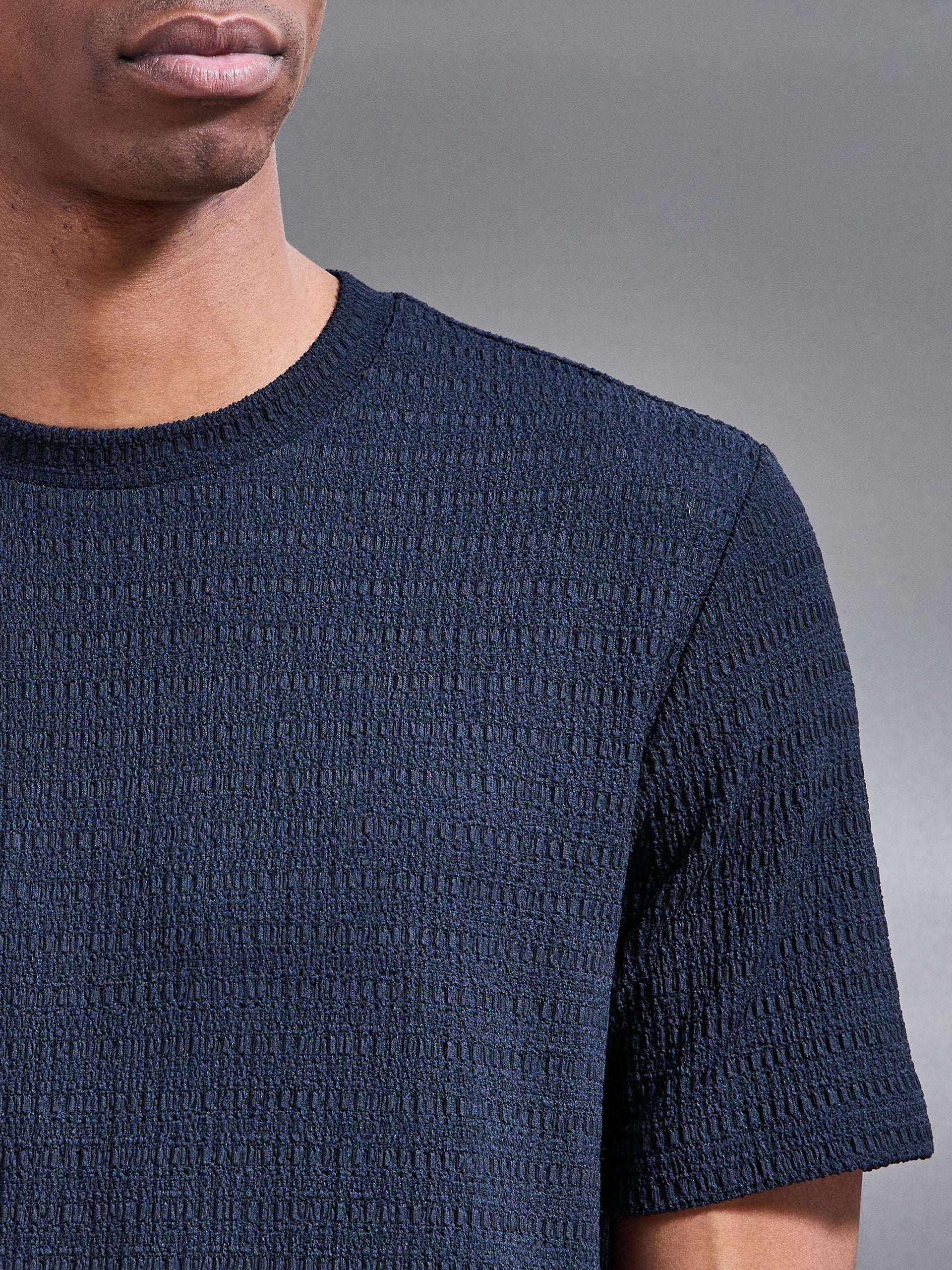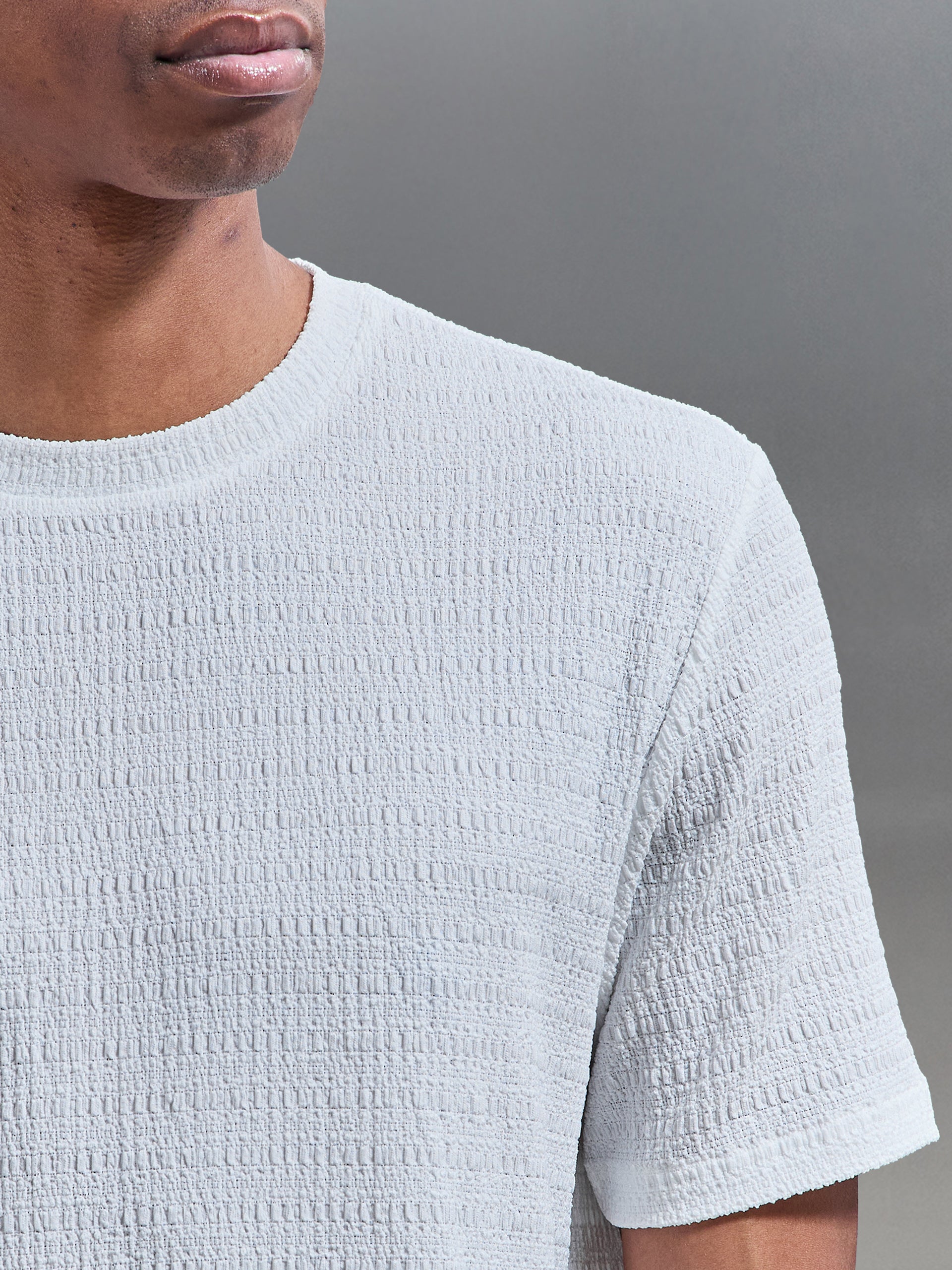 T-shirt coupe slim avec col rond. Seersucker texturé léger. Manches courtes avec ourlet cousu. Ourlet cousu.